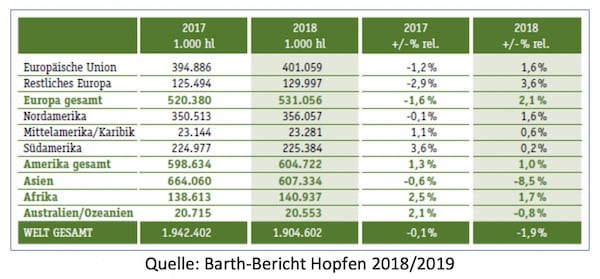 2018 wurden weltweit rund 1,9 Milliarden Hektoliter Bier ausgestoßen; das entspricht einem Minus von 1,9 Prozent. In den verschiedenen Ländern entwickelte sich der Markt allerdings recht unterschiedlich. Das geht aus dem gerade veröffentlichten Hopfenbericht von Joh. Barth & Sohn, Nürnberg, hervor. Seit dem Zweiten Weltkrieg sei der Weltbierausstoß nicht mehr so stark zurückgegangen wie 2018 im Vergleich zum Vorjahr, betont der geschäftsführende Gesellschafter Stephan Barth.