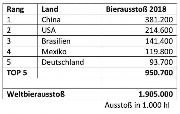 Hauptursache ist den Daten zufolge der Rückgang in China um knapp 60 Millionen Hektoliter. In Europa hingegen war ein Zuwachs um rund zwei Prozent zu verzeichnen, in Amerika stieg die Menge um ein Prozent und in Afrika um fast zwei Prozent. Die Liste der größten Biernationen wird unverändert von China angeführt – gefolgt von den USA, Brasilien, Mexiko und Deutschland. „Auf diese fünf Länder entfallen rund 950 Millionen Hektoliter, also rund die Hälfte der Weltbierproduktion“, fasst Barth zusammen.