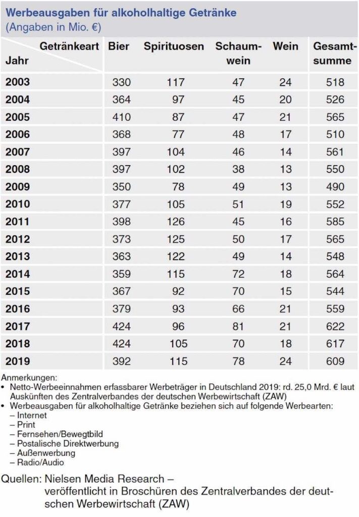 Deutlich mehr als im Vorjahr investierten hingegen die Spirituosen-Unternehmen in Werbung, nämlich 115 Millionen Euro, was einem Plus von 9,5 Prozent entspricht. Dieser hohe Wert wurde zuletzt 2014 erreicht. Auf Platz 3 lag die Schaumweinbranche mit Spendings von 78 Millionen Euro; das ist sogar ein Zuwachs von 11,4 Prozent. Mit 24 Millionen Euro gab die Weinbranche am wenigsten für Werbung aus, immerhin aber ein Drittel mehr als 2018.
