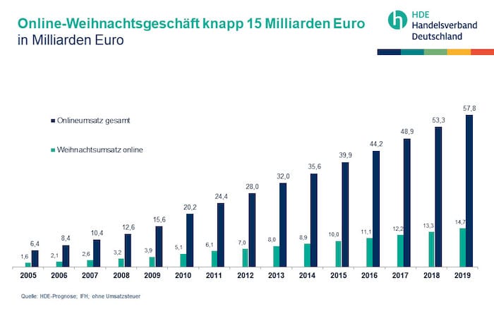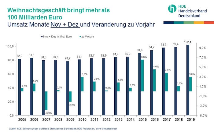 Der Handelsverband Deutschland (HDE) erwartet für die letzten beiden Monate im Jahr ein Umsatzplus von drei Prozent auf dann knapp mehr als 102 Milliarden Euro. Damit steigen die Erlöse gegenüber dem Vorjahr um drei Milliarden und erreichen in November und Dezember die 100-Milliarden-Euro-Marke. Die Online-Umsätze werden im Weihnachtsgeschäft bei knapp 15 Milliarden Euro liegen, was im Vorjahresvergleich einem Plus von knapp elf Prozent entspricht.