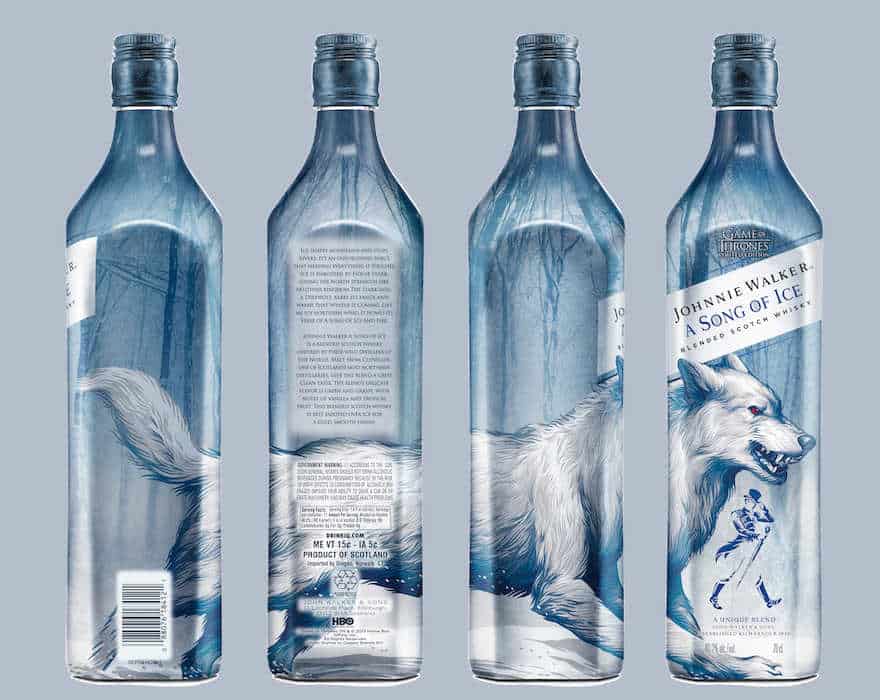 Die Johnnie Walker-Sorte „A Song of Ice“ steht für die Stark-Familie, die in dem Epos Herrscher des Nordens ist, der „A Song of Fire“ repräsentiert die Targaryen, in deren Adern Feuer fließen soll. Dementsprechend ziert die die Flasche eine eisige Kulisse in Blau- und Grautönen mit dem Schattenwolf, die andere präsentiert sich in tiefroten Farben und der Gestalt eines Drachen.
