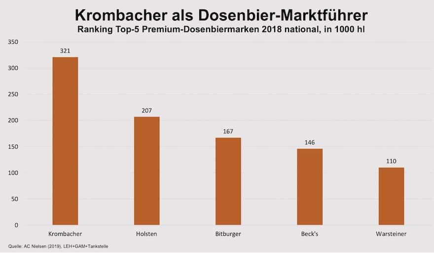Und dennoch: Krombacher bleibt innovationsfreudig. 2014 setzt die Premium-Marke auch auf die Sorte Hell – Schauspieler Matthias Schweighöfer sorgt als Testimonial für den ersten Aufschlag, verschwindet aber alsbald in der Versenkung. Dennoch: Sage und schreibe zwölf alkoholfreie Produkte – darunter ein Fassbrause- und ein 0,0%-Quartett – sorgen im Handel für prallvolle Six-Pack-Regale. In der Gastronomie bleibt Krombacher begehrt, wenngleich der Fassbierausstoß seit der Jahrtausendwende immerhin 170.000 Hektoliter verloren und sich inzwischen bei rund 700.000 Hektolitern eingependelt hat. Der Fassbieranteil dürfte damit bei rund 12 Prozent liegen und damit deutlich hinter Bitburger, Veltins und Warsteiner. Anders im Dosengeschäft. Dort hat es Krombacher geschafft, mit der ersten nationalen Markenlistung einer Biermarke im Aldi das schrumpfende Pilsgeschäft in den letzten Jahren erneut zu befeuern. In der Branche geht man davon aus, dass es durchaus rund 300.000 Hektoliter sein könnten, die der Discountkanal Jahr für Jahr zum Ausstoß beiträgt. Kein Wunder, dass die Krombacher Brauerei damit auch größter Bierdosenlieferant unter den deutschen Premium-Brauern ist.