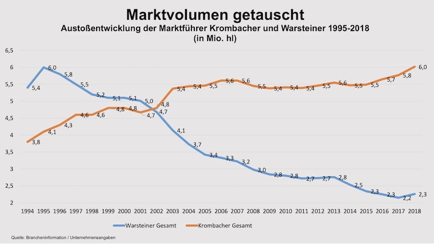 An kein anderes Werbemotiv deutscher Premium-Biere erinnern sich die Deutschen so selbstverständlich wie den Krombacher See mit seiner grünen Insel. Die Marke hat es geschafft: Aus dem kaum wahrnehmbaren Underdog der frühen 1980er-Jahre wurde eine strahlende Markenpersönlichkeit, unter deren Namen 2018 erstmals über sechs Millionen Hektoliter gebraut wurden. Tatsächlich war der Weg schon lange bereitet, als 2002 das noch Jahre zuvor für unmöglich gehaltene Wirklichkeit wurde und die Marke Krombacher den jahrelangen Marktführer Warsteiner ablöste. Und wer sich die Ausstoßentwicklung beider Marken über die Jahrtausendwende hinaus anschaut, weiß, was geschehen ist: Die einstmals sechs Millionen Hektoliter von Warsteiner werden längst in Krombach gebraut. Die Siegerländer haben die Sauerländer Ortsrivalen inzwischen uneinholbar abgehängt.