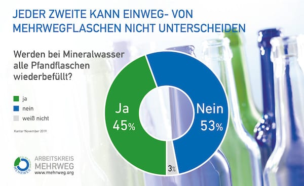 Das Marktforschungsinstitut Kantar befragt im Auftrag des Arbeitskreises einmal jährlich Verbraucher in einer repräsentativen Untersuchung. Auf die Frage, welche Verpackungsart am nachhaltigsten sei, antworteten demzufolge 94 Prozent der Befragten, Mehrweg- seien nachhaltiger als Einwegflaschen. Zugleich seien aber 45 Prozent der Ansicht, dass alle Pfandflaschen wiederbefüllt würden.