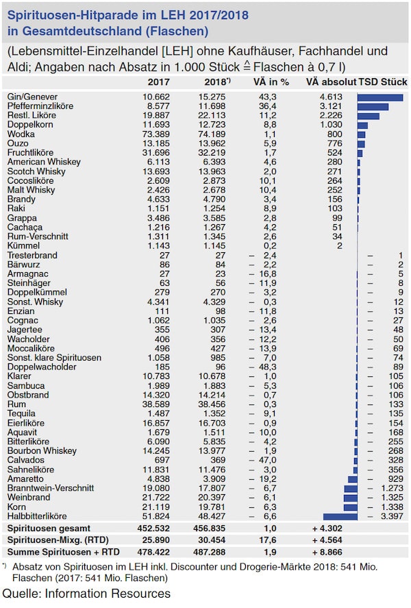 Während sich die verschiedenen Segmente sehr unterschiedlich entwickelten, zeigte der Gesamtmarkt für Spirituosen 2018 wie seit Jahren eine stabile Entwicklung und erreichte einen Absatz von 541 Millionen Flaschen und einen Umsatz von rund 4,4 Millionen Euro.